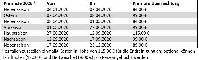 Nachfolgend sehen Sie die Preisliste sowie die Belegung der kommenden Monate. Zudem haben Sie über das Buchungsportal die Möglichkeit direkt eine Buchungsanfrage für die Ferienwohnung zu stellen. Wir werden diese umgehend bearbeiten und uns mit Ihnen in Verbindung setzen.